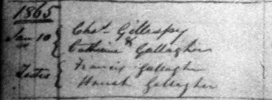 Charles Gillespie, Bogside, Dunkineely, 28 yrs, Cooper, son of Charles, married Catherine Gallagher, Bogside, Dunkineely, 19, dau of Patrick,
