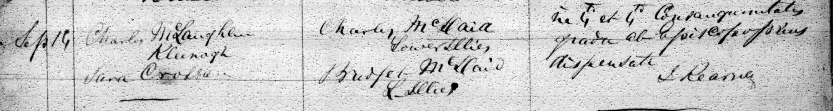 Notes: Charles McLoughlin, Cleenagh, son of John, married Sara Crossan, Middle Illies, dau of Neal, 14 Sep 1872. Witnesses Charles & Bridget McDaid Note of 4th degree consanguinity (3rd cousins) - see marriage register Son John b 7 Jul 1874, married Mary Anne McGonagle, Kinnagoe, dau of Patrick, 21 Nov 1899 Mary Anne McGonigle b 26 May 1877 dau of Patrick McGonagle and Madgey McDaid - see 1901 census Kinnagoe |