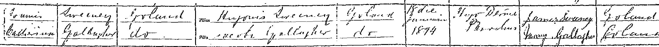 Note: Dolty Sweeney, son of Hugh, married Catherine McHugh, Cranford, dau of Michael, 2 Jan 1899. Witnesses Michael Gallagher, Labad? and Margaret Gallagher, Cranford |