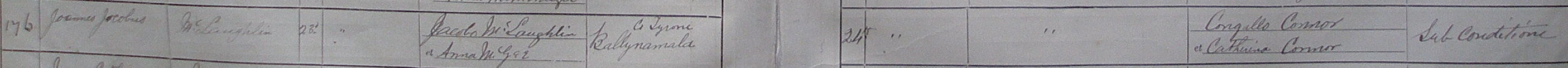 Notes: Hugh McGee, Glenleehan (Meenmore West), son of James, married Catherine O'Connor, Drumaneany, dau of Daniel, 4 Feb 1869. 3rd degree consanguinity noted. Witnesses Patrick and Mary McGee, Loughnambraddan - see scan of Marriage Register Hugh's siblings - see below Children of Hugh and Catherine : James b 30 Oct 1869, bapt 4 Nov Anne b 19 Feb 1872, bap 20 Feb, godparents John O'Connor and Catherine McDevitt - see scan of Baptism Register - Anne marr James McLaughlin - their son John James b 23 Dec 1893 Ballynamallaght, Co Tyrone, bap Fintown 24 Dec, Godparents Condy & Catherine Connor - see scan of Baptism Register Mary b 1 Dec 1879 Margery Patrick Cassie |
