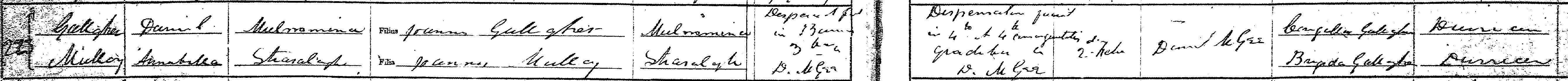 Note: Edward Gallagher, son of John, married Catherine Mulloy, Strasallagh, dau of Daniel, 8 Feb 1872, witnesses Annabella Mulloy, Strasallagh and Patrick Mulloy, Mully. 4th degree consanguinity noted Son Daniel b 7 Jun 1880, d 20 Jul 1910, Atlantic City, NJ - see Memorial page |