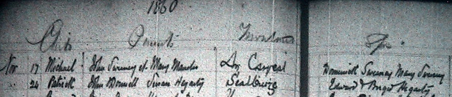 Patrick b 24 Nov 1860 in Shalwy, Godparents Edward and Bridget Hegarty - see scan of baptism register