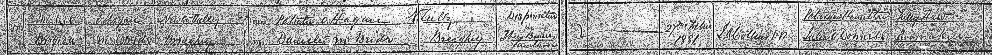 Michael O'Hagan, Newtown Tully, son of Patrick, married Bridget McBride, Breaghy, Conwal, dau of Daniel, 27 Feb 1881 in Ramelton. Witnesses