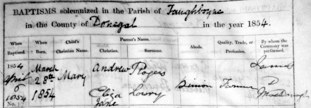 Andrew Rodgers, Tirkeeran, Clonleigh, son of Andrew, m Eliza Jane Lowry, Binnion, dau of William, 20 Nov 1851. Witnesses John Wilkey and