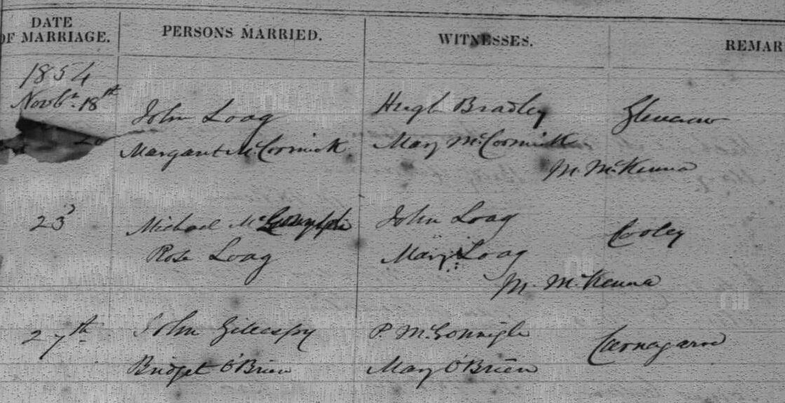 John Gillespy, Carnagarve, married Bridget O'Brien, Carnagarve, 27 Nov 1854. Witnesses P McMonigle and Mary O'Brien - see marriage register