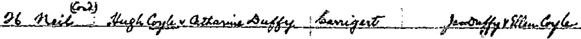 Hugh Coyle, 25, farmer, Carrigart, son of Michael, married Catherine Duffy, Drumnamona (Umlagh), 21, housemaid, dau of James Duffy, 9 Feb 1865 in Carrickart. Witnesses