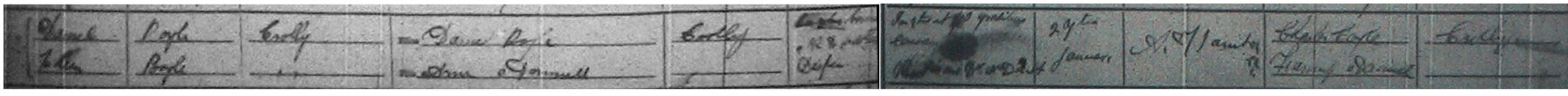 Daniel Boyle, Crolly, son of Daniel, married Ellen Boyle, Dore, dau of Anne O'Donnell, 29 Jan 1876. Witnesses Charles Coyle and Fanny O'Donnell, Crolly. Note of 3 and 4