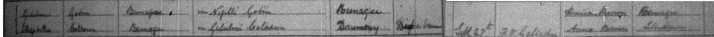 No Surname First Relationship Religion Education Age Occupation Status Born Lang 1 Hegarty James Head RC Can't read 60 Agricultural Labr Widower Donegal Hegarty Anne Dau RC RW 28 Labourer's dau Single Donegal Hegarty Mary Dau RC RW 22 Labourer's dau Single Donegal Hegarty Bernard Gson RC RW 15 Single Donegal Hegarty James Gson RC Can't read 3 Single Donegal William Gibbons and Elizabeth Colhoun Household 2 Gibbons William Head RC RW 54 Farmer Married Donegal Gibbons Eliza Wife RC RW 45 Married Donegal Gibbons Margaret Sister RC RW 58 Seamstress Single Donegal Gibbons Charles Son RC RW 15 Scholar Single Donegal Gibbons Lizzie Dau RC RW 14 Scholar Single Donegal Gibbons Mary Dau RC RW 8 Scholar Single Donegal Gibbons George Son RC RW 5 Single Donegal Gibbons Catherine Dau RC Can't read 3wks Single Donegal Notes: