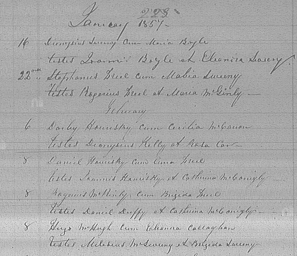 Hugh McHugh married Eleanora Callaghan 8 Feb 1857 in Tamney, Clodavaddog Parish - see Marriage Register entry