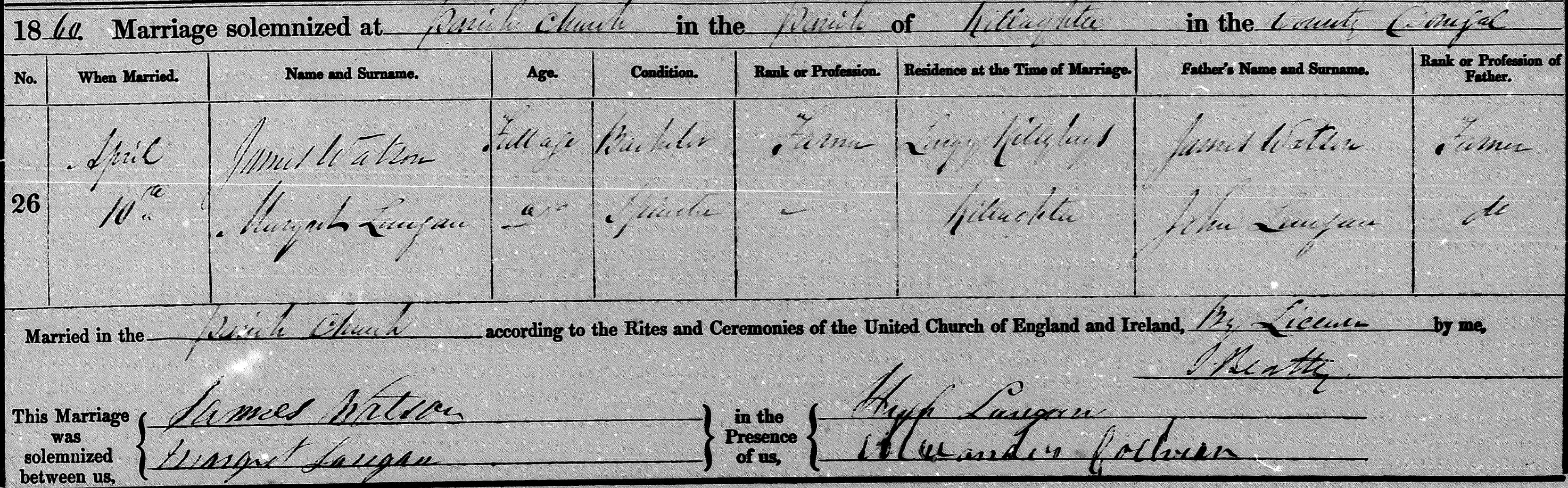 Notes: James Watson son of James jnr Watson and Elizabeth Watson, baptised 20 Feb 1835 - see scan from register James jnr and Elizabeth, both of Largysillagh, married in Killbegs on 19 Aug 1822 James Watson married twice: 1. Margaret Langan, 10 April 1860 in Killaghtee - see scan from register - Margaret died 29 Feb 1880, buried 1 Mar 1880 aged 39 years - see headstone inscription 2. Mary Ann Walsh, Kilcar, 1883 James died 3 Aug 1919 and is buried with Margaret in the St John's Church of Ireland Graveyard in Killybegs Son Alfred b 1 Oct 1892, baptised 10 Oct 1892 - see scan from register Son Alfred (2yr10mths in census) b 6 Jun 1898, baptised Charles Alfred 12 July 1898 - see scan from register For more on the family see James Watson Pedigree Resource File Researcher : Jahanna - Email |