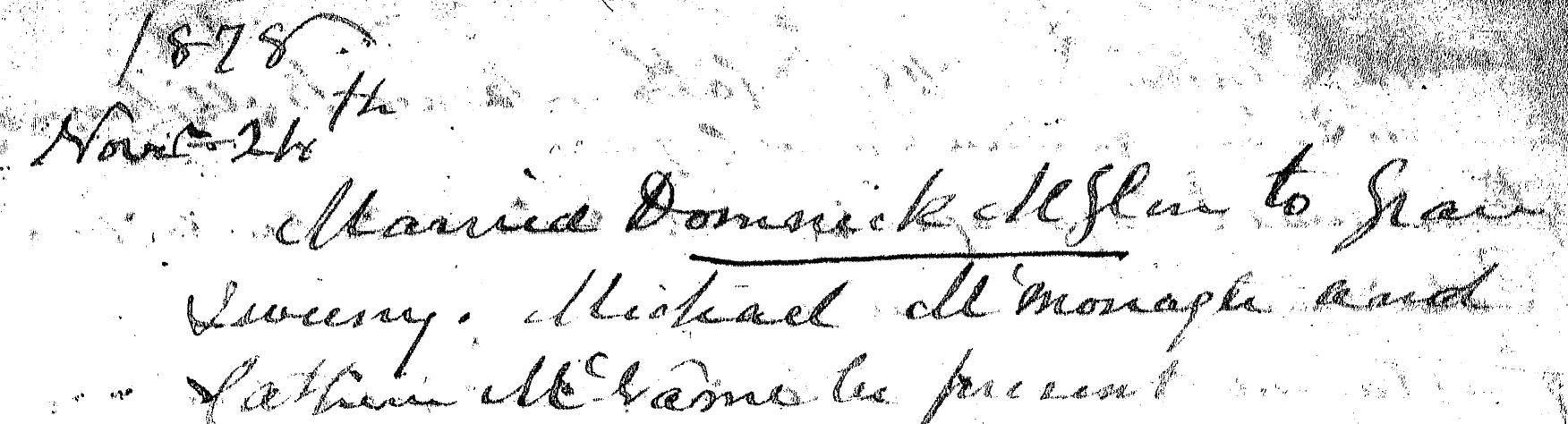 Dominick McGlynn, 25, farmer, son of Charles, married Grace Sweeney, 19, Arbatt, dau of Peter, 24 Nov 1878. Witnesses Michael McMonagle