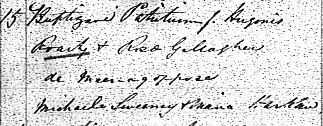 2 February 1859, baptism of Bridget, dau of Patrick McGee & Mary Gallagher, Meenagappoge. Sponsors Edward & Catherine Gallagher - see church baptism