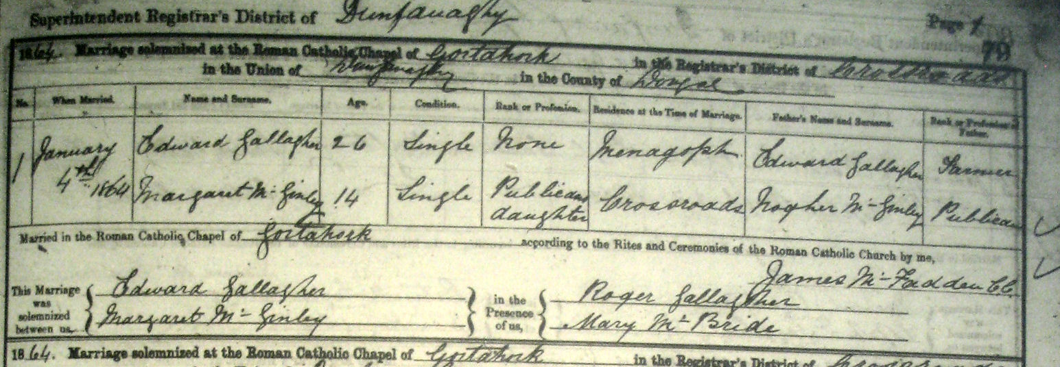 Edward b 1838 married Margaret McGinley, 14, Crossroads, Publican's daughter, dau of Nogher, 4 Jan 1864. Witnesses Roger Gallagher and Mary McBride - see marriage register