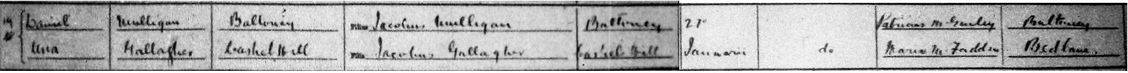 Daniel Mulligan, Beltany, son of James, m Una Gallagher, Cashel Hill, dau of James, 27 Jan 1900. Witnesses Patrick McGinley, Beltany and