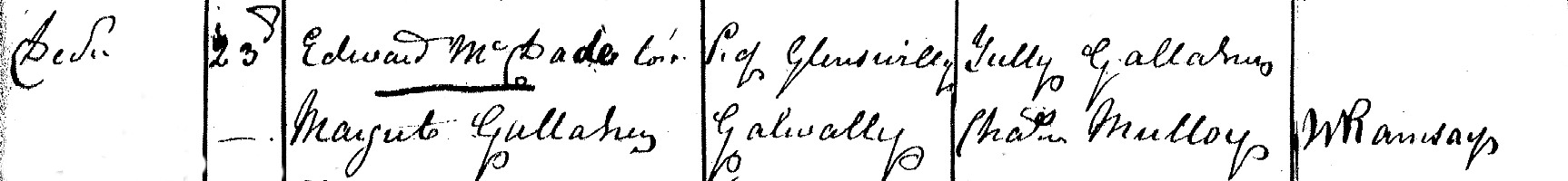 1. Margaret married Edward McDade of Glenswilly 23 Dec 1858 in Cloghan. The witnesses were Tully Gallagher and Charles Mulloy - see marriage register